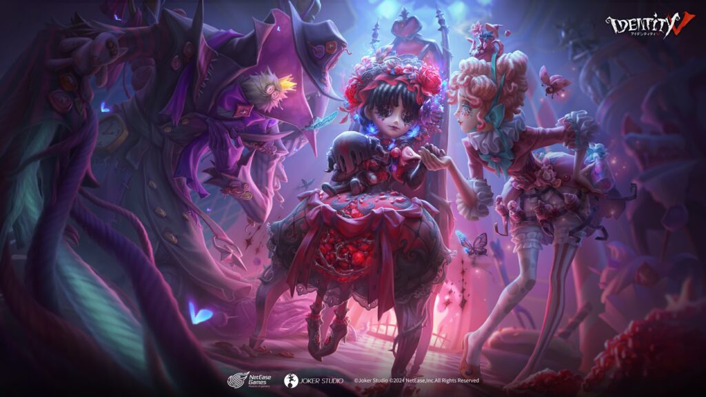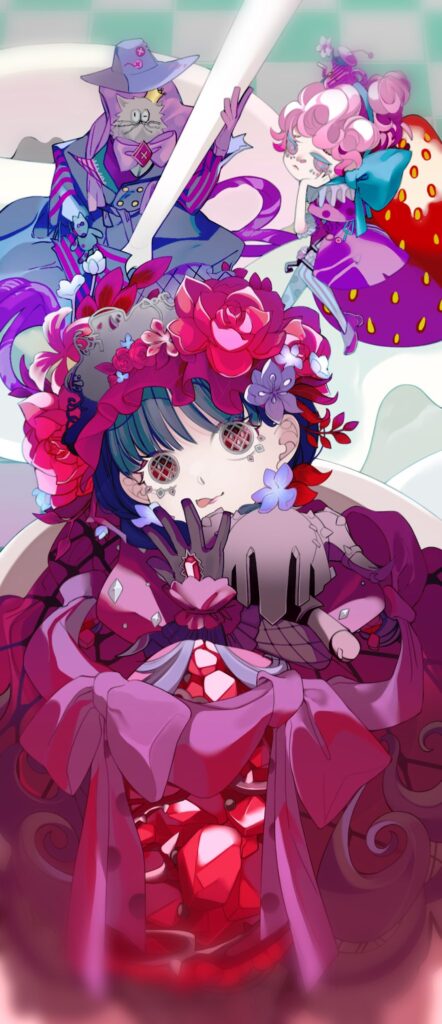 本作は、スマートフォンアプリ『第五人格(Identity V)』に登場するキャラクターたちの新規衣装(「不思議の国のアリス × ザクロ」)実装を記念して制作したファンアートです。アリスモチーフにおける「サイズ変化」や、PVで登場する装飾・食べ物のビジュアル要素をもとに、構図と世界観を再構成しました。