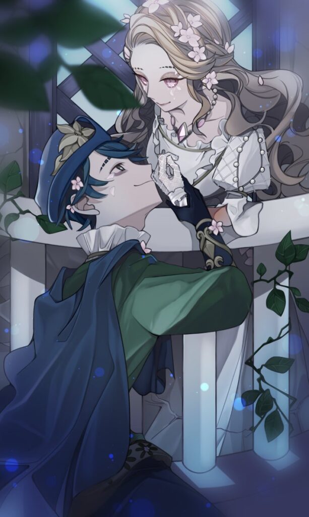 この二人はゲーム内で「公式カップル」として設定されており、本作ではその関係性を軸に、密会のワンシーンをビジュアル化。『ロミオとジュリエット』の原作を踏まえた上で、劇中の“静かに惹かれ合う瞬間”を再現するように構図と空気感を設計しました。 - 構図と視線誘導: