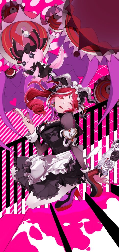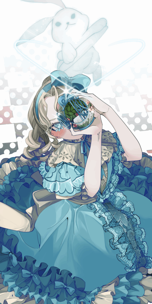 『不思議の国のアリス』で印象的な「身体が小さくなる」という要素を視覚的に強調するため、少女キャラクターをティーカップの中に収める構図を採用。これにより、ファンタジー的なスケール感と、テーマに基づいた可愛らしさ・不思議さを両立しています。また、衣装テーマである「ザクロ」も意識し、色や装飾の選定に慎重を期しました。 - 演出とビジュアル要素: