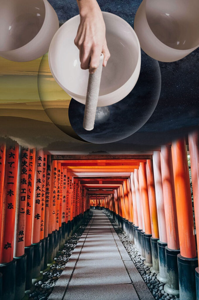 告知などで使えるように、真ん中には多くの物は置かず、上のほうにメインの”クリスタルボウル”を配置し下には開催される場所をイメージしやすいよう神社の鳥居を配置しました。