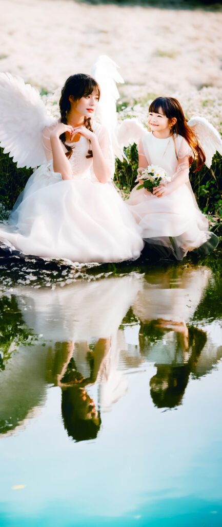 画像の幅を拡張し、右に「小さい天使の可愛いアジア人の女の子」を生成。何度か顔を重ね、元の女性を見上げてる画像が出るまで生成しました。